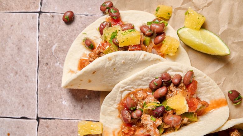 Picadillo is a traditional comfort food in Latin American countries, such as Cuba and Mexico. Though it's unclear where exactly picadillo originated, it's safe to assume the dish came from Spain and moved with Latin American travelers. Picadillo, which comes from the Spanish verb picar, meaning "to chop," always comprises chopped or ground meat and spices. Not quite a stew but also more than just beef, picadillo can be made with tomatoes, potatoes, peppers, onions, olives, and even raisins. The Cuban version is typically made with pimiento-stuffed green olives, cinnamon, and raisins; it sometimes involves tomatoes and almost always features beef. Picadillo is usually served on a bed of rice with a side of Cuban black beans, and this recipe turns the dish into tacos with a soft flour shell and a Cuban-inspired black bean salsa topping. Developed with Michelle McGlinn, this easy weeknight taco recipe will surprise you with rich, salty flavors complemented by zesty citrus salsa.