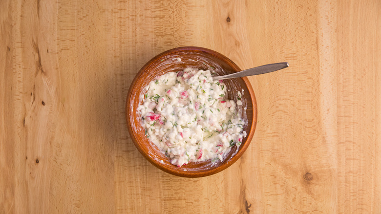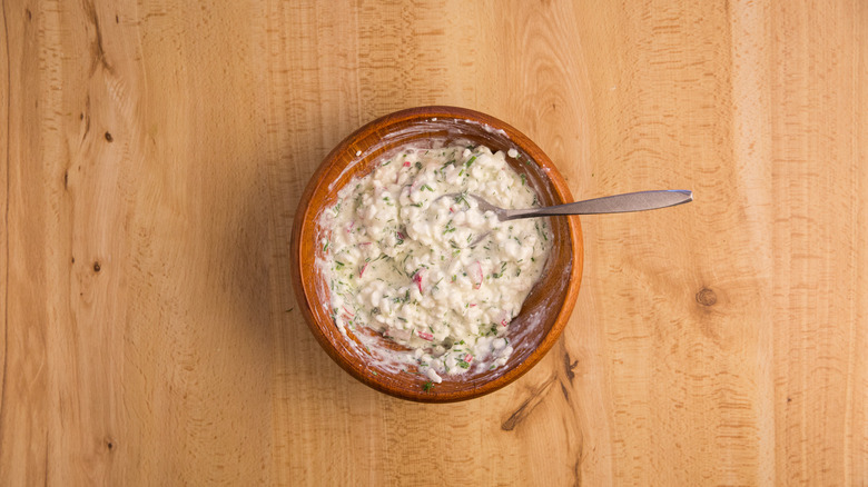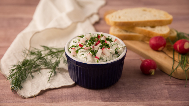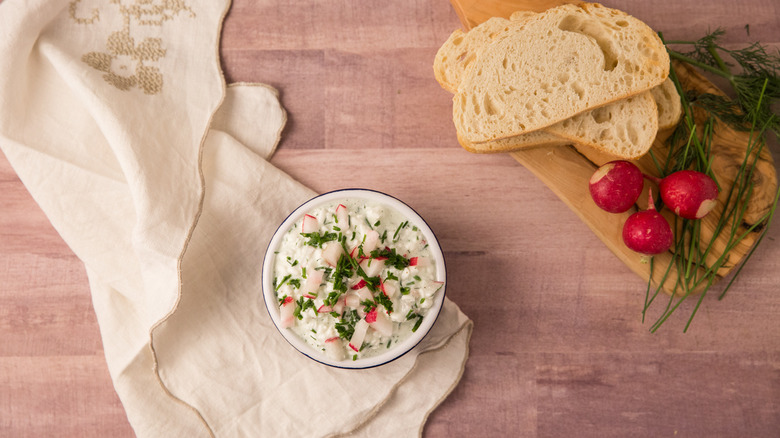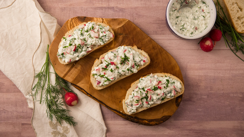 Twaróg or other farmer's cheeses may be hard to find, so recipe developer Michelle Bottalico has created a recipe for gzik that uses store-bought cottage cheese mixed with Greek yogurt to achieve the same, creamy result. Since twaróg is basically a dry cottage cheese, this recipe is similar to the original. Radishes, chives, and dill are mixed into the cheese to add a slightly spicy flavor, fresh herby notes, and a little crunch, all of which complement the mild cheese. Gzik is traditionally served over baked potatoes or for breakfast on buttered rye bread. Cottage cheese is a popular choice for nutrient-rich diets, so this could be a great new way to start your day. If you're anything like us, you just may fall in love with this delightful, easy-to-make recipe.