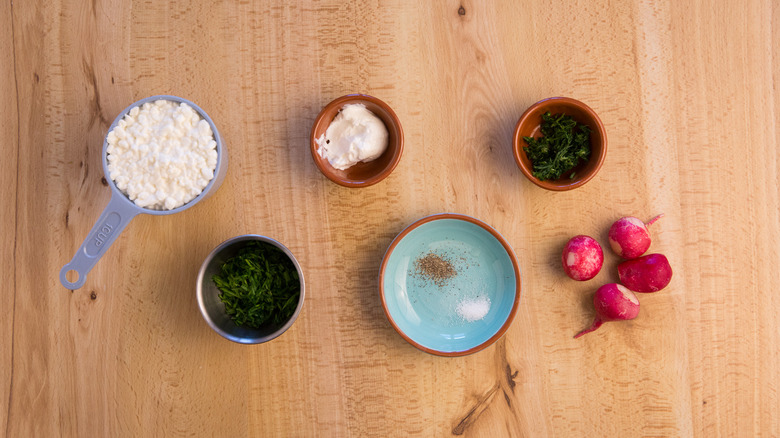 For this recipe, you will need cottage cheese. Look for small-curd cottage cheese, because large-curd versions will be lumpier, and the traditional recipe made with dry farmer's cheese is smooth. You'll use a little Greek yogurt to mix with the cheese and make it even creamier. Have radishes, chives, and dill on hand for mixing with the cheese. Finally, grab some salt for the final seasoning.