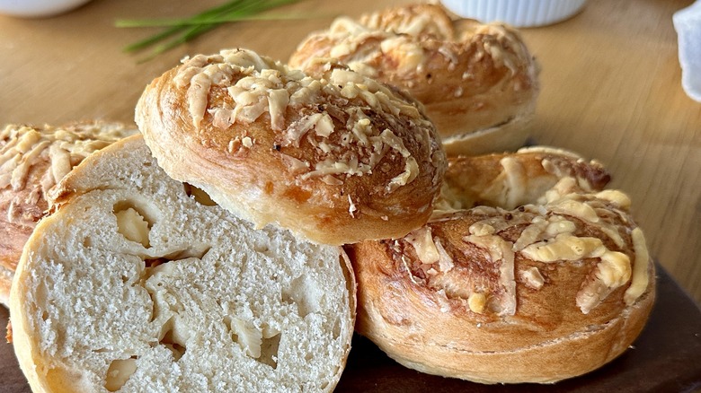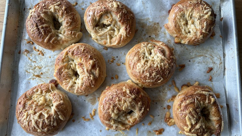 If you thought you'd never achieve the texture of store-bought bagels at home, think again — these homemade Asiago cheese bagels are about to flip that idea on its head. These bagels start with a short kneading process that's almost completely hands-off thanks to the help of a stand mixer with a hook attachment. If you don't have a hook attachment (or stand mixer) don't worry — you can easily knead this supple dough by hand, adding a few extra minutes to the kneading time to ensure a crusty result. The rest of the process is where you'll really start to have some fun. The dough will rise, then get shaped into rings, and those rings will be boiled in a baking soda bath. The baking soda bath, with a hint of brown sugar, will help the bagels brown and develop a chewy texture and crisp crust as they bake.