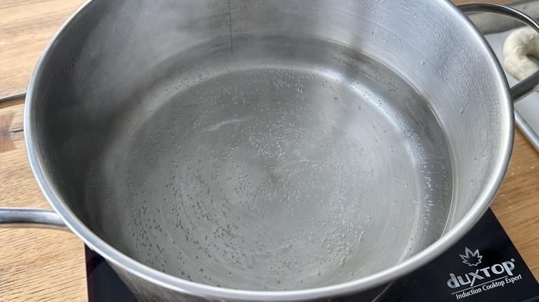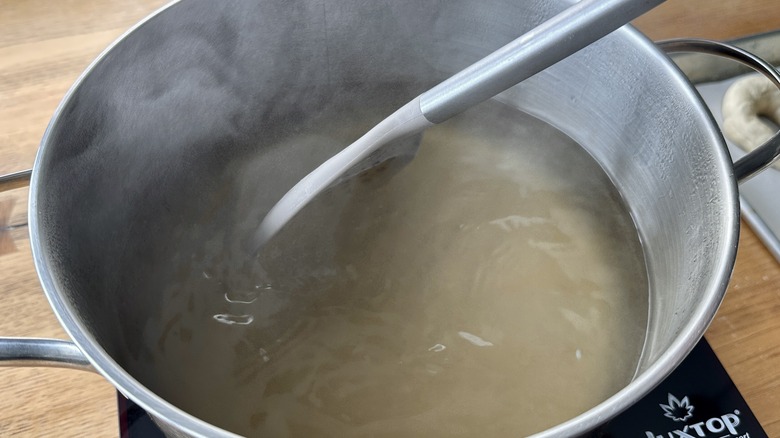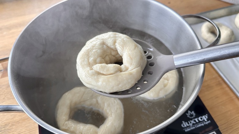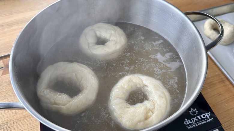 - Add a few bagels at a time to the simmering liquid.