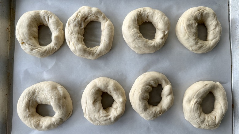 - Cook on one side for 1 minute, then flip and cook for 30 seconds. Repeat with remaining bagels, transferring them back to the baking sheet after boiling.