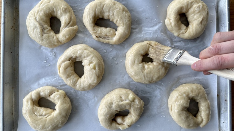 Brush the egg white over the bagels.