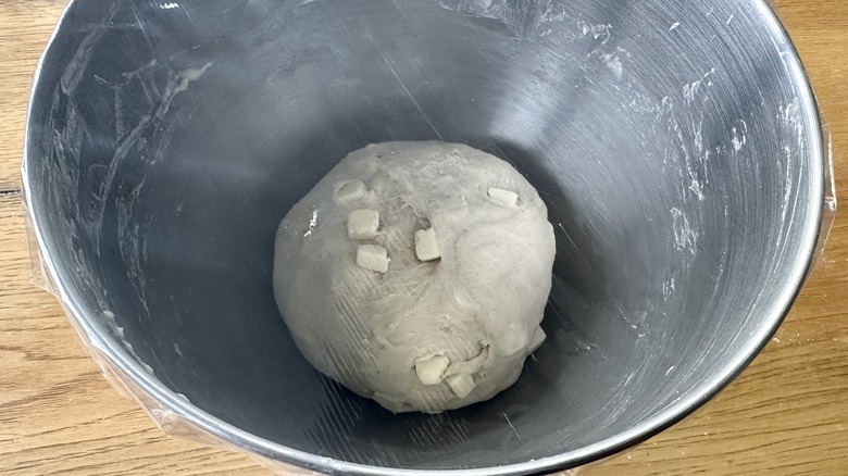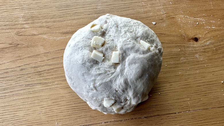 - Transfer dough to a clean surface and knead in cubed cheese.