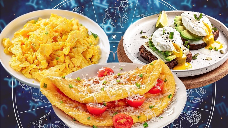 Zodiac signs are about as ubiquitous to society as eggs are for breakfast — and, although there are some fabulous egg substitutes out there, there's no escaping either. From your dating profile to office luncheons, you're bound to be asked what your sign is at any given time of day, and you better be prepared to be slightly judged for it. Your eggs, on the other hand, are usually reserved for the mornings, if not brunch. They're also a fairly judgment-free topic, as long as they're also antibiotic and cage-free. At the end of the day, an egg is an egg, no matter how you crack it. But why not try eating them based on your zodiac sign, just for fun?
