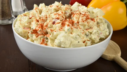 We know that hummus pairs beautifully with Mediterranean flavors, so if you're looking for a starting point to test out this ingredient in potato salad, try a bowl that incorporates mix-ins like olives, artichokes, red pepper, red onion, cucumber, and feta cheese. If you want to add a little extra punch to balance out hummus' mild creaminess, try a dash of lemon juice or red wine vinegar. Almost any recipe can benefit from this tahini-based spread, so feel free to incorporate it into French, classic Southern, or creamy dill potato salad as well.