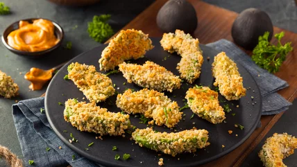 If you're using the stove-top, deep-frying method, the oil temperature should be between 350 and 375 degrees Fahrenheit. Avocado wedges should become golden and crispy after two or three minutes in bubbling oil. For baked avocado fries, arrange breaded avocado wedges over a parchment paper-lined baking sheet and throw them in the oven for 12 minutes at 425 degrees Fahrenheit. An air-fryer will reduce cooking times by around half; place breaded avocados directly onto the fryer tray to cook at 390 degrees Fahrenheit for seven minutes, flipping halfway through.