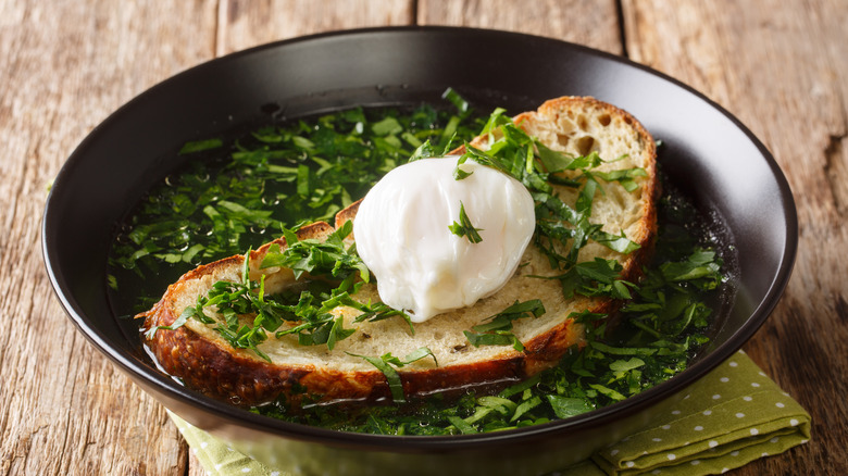 One of the most distinctive dishes from Portugal's Alentejo region, açorda is a hearty bread soup that's often topped with poached eggs. The key ingredient is the legendary local bread, pão alentejano, which should be left out to get a bit stale before being sliced, cubed, or torn up into large pieces.