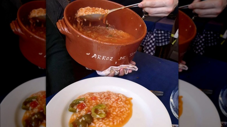If you speak even a little bit of Portuguese, you'll know right away that this dish involves the classic combination of rice and tomatoes. Literally meaning "tomato rice," Portuguese arroz de tomate is a soupy concoction seasoned with garlic, onion, peppers, fresh herbs, and plenty of olive oil. The rice in question is usually short-grain carolino rice, which is native to Portugal. It's similar to the kind you might find in other iconic rice dishes like risotto or paella — but different from the long-grain rice used to make arroz de pato (another famous, but not vegetarian, Portuguese rice dish).