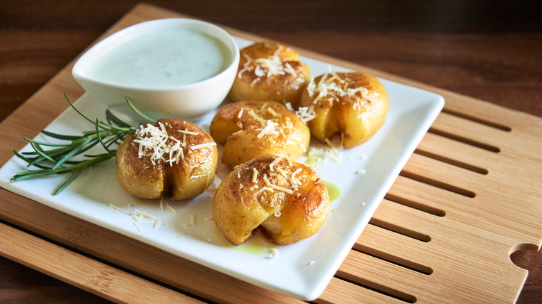 The "punched" part refers to the way the potatoes are slightly smashed — not completely crushed like your average mashed potatoes, nor nearly flattened like the viral smashed potatoes you might be picturing. Essentially, they're small potatoes that are first boiled and then broken just a bit before being roasted in the oven. The result is soft on the inside and crispy on the outside and ideally drizzled liberally with Portuguese olive oil. Like many other traditional vegetarian Portuguese dishes, batatas à murro are commonly served as a side. If you're at a tasca with no vegetarian main dishes on the menu, try ordering them along with a few other sides to create a makeshift meatless feast.