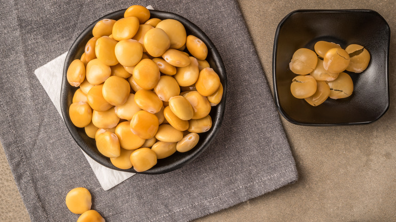 Like olives, tremoços are served straight out of the jar — and also like olives, they often come with a small empty dish. In this case it's not for pits; it's for the thin skin that surrounds the legume, which should be removed before chewing it up. The most common way to do this is by putting the whole thing in your mouth, removing the outer layer with your teeth, and then using your fingers to grab it and place it in the dish.