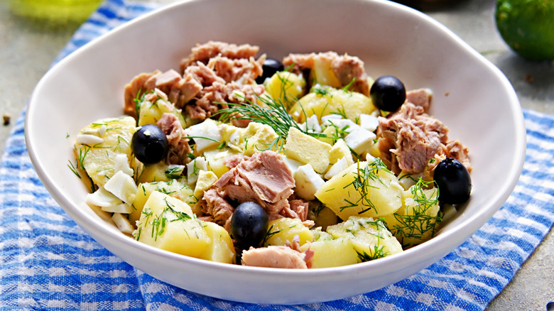 One of the many flavorful foods we have to thank Greece for is Kalamata olives. The olives are named after the city where they were originally harvested, which is one of the reasons why Kalamata olives are so unique. If you've ever taken a bite of these dark-purple olives, you know the variety packs a rich and salty punch with slightly fruity notes. You might use them in an authentic Greek salad paired with fresh feta cheese, but its flavor is also why it joins the list of the best ingredients to elevate potato salad.