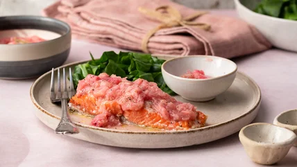 Serve the salmon hot, topped off with a few spoonfuls of rhubarb sauce.