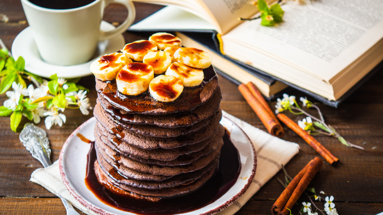 Some folks love the tangy flavor of buttermilk in their pancakes and may be wondering if they can still proceed. The answer is yes, but it's not as straightforward. You can go about this swap in a few ways. First, you can opt to reduce the amount of buttermilk in your favorite recipe and replace it with chocolate milk, but this can lead to neither flavor being as present as you'd like. Second, you can go the DIY route and make chocolate buttermilk with cocoa powder as you would homemade chocolate milk, but with buttermilk as the liquid. Lastly, you can add the chocolate milk as the liquid in your recipe along with a teaspoon or two or buttermilk powder, which adds the same flavor without altering the liquid content of your pancake batter.
