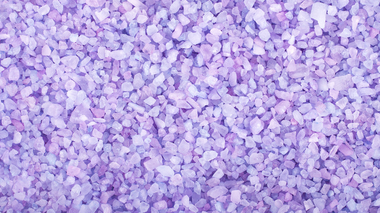 You may need to break up the forming crystals part way through the dehydrating process, but by the time you're finished, you should be left with a layer of residue that's similar in consistency to hard candies. Now, we need to combine our violet crystals with sea salt, and while you can do this in a bowl with the back of a spoon, a mortar and pestle is most effective. Add the sea salt to the violet crystals one pinch at a time, and grind the two together until they're fully combined and you're happy with the taste — it's as simple as that.