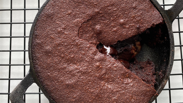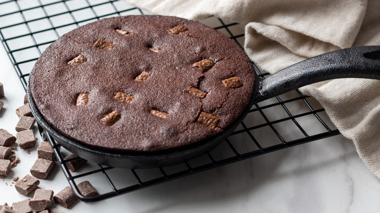 Unlike typical sheet pan brownies, which you can set up for success by lining the pan with parchment paper, skillet brownies require you to pour the batter straight into the iron in order to achieve that sizzling, decadent result. But here's where things get tricky. Compared to other types of metal used for cookware, such as aluminum or copper, cast iron is a denser material, meaning that it takes longer for it to heat up and distribute that heat evenly throughout its surface area. Once a cast-iron pan does get hot, though, it stays hot, maybe for longer than you anticipate.