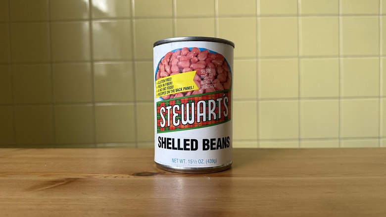 Depending on where you're located in the country, you may or may not be able to find Stewart's shelled beans. They hail from Maine, and they're made by a pie canning company. Generally, you're only going to see them in the Northeast. That being said, you should definitely try to get your hands on them if you happen to see them in your local grocery store because they're one of the better bean brands on the market. Before we even mention the flavor, we have to talk about the branding: This can look whimsical and old-fashioned, which makes it something that catches your eye in the grocery store.