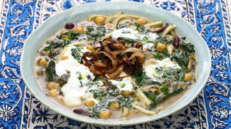 This Persian noodle soup is quite distinct from the average noodle soup — and, of course, reflecting Iranian tastes, it is rich in herbs. A variety of beans and lentils are cooked with onion, scallions, spinach, mint, and parsley. As the soup is cooking, add cooked noodles to the mixture. If you can't find the traditional noodles at a local Persian food shop, spaghetti or another type of pasta make a fine substitute.