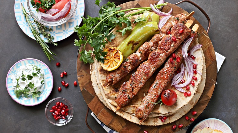 Meat can either be skewered and grilled in pieces or minced, mixed with spices, shaped into a long stick, and then grilled. Enjoy the grilled meat on its own or turn it into a kebab sandwich. Stuff fresh pita or another flatbread with the meat and top it with fresh veggies like lettuce, cucumber, tomato, red onion, and spring onion. Sprinkle a few herbs on top and squeeze some lemon or orange juice for a hint of citrus. Enjoy!
