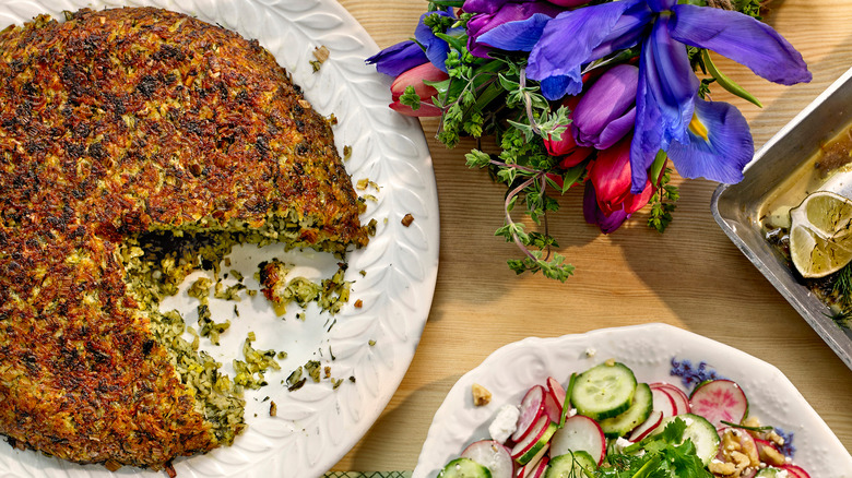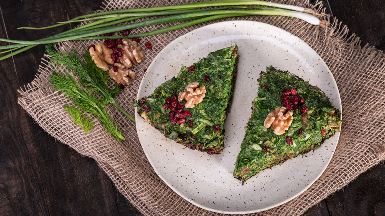This flavorful, festive dish gets its dark green color from cilantro, dill, parsley, and chives. Kuku sabzi is further a natural fit for Nowruz, as the herbs symbolize rebirth, and the eggs symbolize fertility. In addition to being delicious, it is also a perfect way to use up wilting herbs in your kitchen. Blend the herbs and scallions in a food processor with olive oil. Whisk the eggs with cardamom, cinnamon, cumin, salt, pepper, and baking powder. Fold in the herbs. Walnuts and barberries — or cranberries, if you can't find barberries — add texture and some nutty and sweet notes that complement the herbs. While kuku is typically cooked on a stovetop, it can also be baked in the oven, which results in a light, fluffy, and herby frittata.