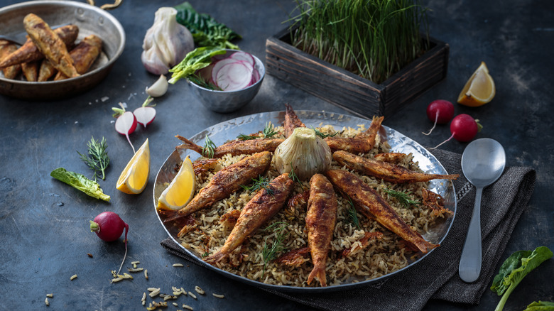 A popular — and delicious — way to fix the fish is pan-frying it with saffron and lemon. This recipe is called mahi ba zafferan in Farsi. Season the fish with salt and pepper, dredge it in a flour-turmeric mixture, and pan-fry the fish in a heavy skillet. After browning the first side, flip it over and pour over a mixture of lemon juice and saffron water. This combination is simple, light, and flavorful. If you're feeling fancy, stuff the fish with walnuts, herbs, onion, and pomegranate molasses (a staple in many Persian dishes).