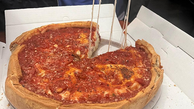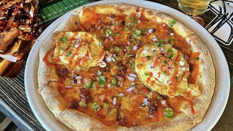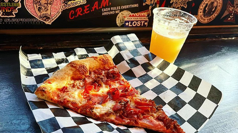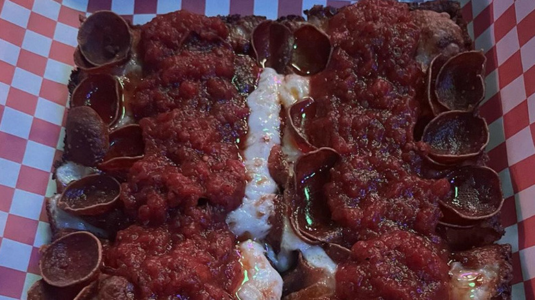 The humble exterior of the Red Dwarf may not scream "gourmand destination," but the acclaim from locals and visitors alike should be enough to inspire you to brave the building's devilish red facade (or you can place an order off of the pizza delivery app, Slice). Under the "Most Popular" section of Red Dwarf's Slice page, the restaurant makes its position known with the Pineapple Does Belong on Pizza, which comes with the titular fruit, brown sugar glazed ham, and jalapeños. The white pizza also gets especially noted in online reviews and comes with a garlic cream white sauce, mushrooms, and peppers. The Meatsa Meatsa pizza again features brown sugar glazed ham, plus ham and old-school cup & char pepperoni. So saddle up to Red Dwarf for some tiki cocktails, rock 'n roll, and some excellent Detroit-style pizza, some of the best in the Las Vegas area.