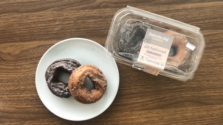 As I shopped, I glided right by the brand's glazed rendition and instead turned my attention to an assorted pack of sour cream and chocolate cake donuts which Target explains come "in an old-fashioned style, with a slightly crisp outer, a moist, cakey inner and a sweet glaze." I agree with most of this description, except for the term "a sweet glaze," which I find to be a bit of an understatement. The sour cream donut especially is so cloyingly sweet that I think I acquired a cavity on impact. The wave of sugar made it feel like I was spooning an entire jar of frosting into my mouth at once.