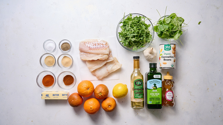 The first thing you'll want to grab is cod, which is an inexpensive whitefish known for being dense and mild in flavor. Cod is a good choice for blackening because it can take on both the flavor and the high heat cooking, but if you want to swap it out, try tilapia instead. For blackening the cod, you'll need paprika, garlic powder, onion powder, cayenne, salt, pepper, and butter. From there, you'll need olive oil, lemon, garlic, Champagne vinegar, and honey to make the dressing, and arugula, watercress, and cannellini beans to make the base of the salad. The only ingredients you'll need from there are two types of citrus, naval and blood oranges, that feel mostly firm.