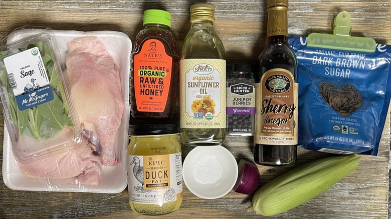If chicken is the go-to poultry served in your home (with a seasonal turkey feature), it's time to expand beyond the usual. Switch it up by cooking duck, an excellent alternative that's packed with flavor and a succulent texture while sticking to the breast, leg, and wing combo you're already familiar with. Tasting Table recipe developer Kara Barrett shares this juniper duck with corn and sage relish, highlighting duck legs with a savory rub and tangy garnish.
