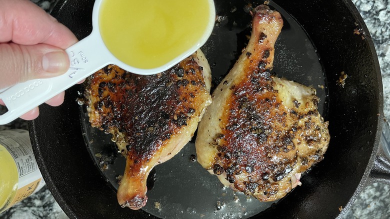This recipe uses a hefty amount of fat to achieve a juicy consistency, which is similar to the technique used for making duck confit. Duck fat is highly revered among chefs for its savory flavor and optimal cooking properties, but if you're looking to keep your fat intake low, there are alternative methods to prepare this dish. Barrett says, "Instead of adding more duck fat, you can opt to drain some of the excess fat to store and slowly braise the duck in stock instead."