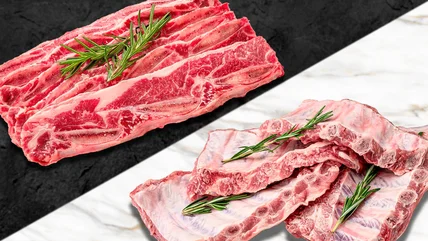 On the other hand, beef ribs expand to numerous cooking applications. Short ribs offer a treasure trove of recipes. Beyond the classic braised in red wine recipe, the cut performs well with a quick sear, too, producing rarer morsels of meat ready to slice up and top salads, bowls, and noodles.