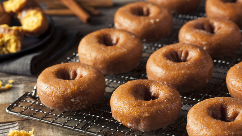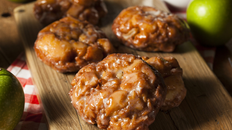 Apple fritters don't just have to be an item reserved for the fair or for when your local donut shop has them in stock. This recipe couldn't get much easier when you have a box of pancake mix at your disposal. You'll want to mix in some extra sugar, cinnamon, and vanilla extract to give your fritters an edge before gently folding in the apples. When you're ready to cook, carefully drop your fritters into the hot oil. Remember to watch out for splattering grease, as these fried treats are extra sputtery. After your fritters have cooled for a brief moment, you can top them with your glaze and serve them warm.