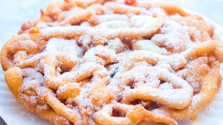 You can transform pancake mix into funnel cake by mixing it with a bit of sugar to create a similar flavor profile to funnel cake batter. Part of the fun in eating this fried treat is also enjoying its unique, twisty shape, which is made possible when you transfer your batter into a squeeze bottle, piping bag, or a resealable bag with the tip sliced off. Alternatively, you can also pour the batter into the dessert's namesake funnel, but we think the other options are a bit more amusing. Top your treat with fruit, powdered sugar, or chocolate sauce.