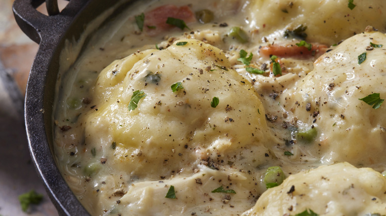 You can make an easy dumpling recipe by mixing together your pancake mix with a little bit of milk — just make sure you don't use too much. If you've ever made drop biscuit dough before, you know that the texture of it is quite stodgy, rather than the smooth, liquidy, spreadable consistency of traditional pancake batter. Once your stew is on the stove, you can plop a few spoonfuls into the pot, cover it with a lid, and simmer until the dough is cooked through. While this recipe may require that you pay specific attention to the thickness and consistency of your dough to ensure it comes out dumpling-like, the tasty result will surely be worth the effort.