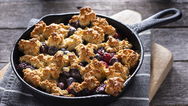 We have fond childhood memories of diving into a bowl of peach cobbler on a humid summer evening. But, with pancake batter, this treat can be made year-round with whatever fruit — fresh or frozen — that you can get your hands on. You'll want to start by mixing your pancake mix as normal until no lumps remain. Then add any additional seasoning, like a sprinkle of cinnamon or baking spice, to amp up the flavor and make it more cobbler-like. From there, spoon it on top of your fruit and pop it in the oven. Like a standard cobbler recipe, you'll know that this one is ready to pull out of the oven when the top is solid and golden brown and the fruit is juicy and soft.