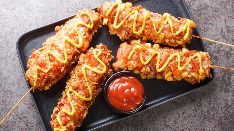 You don't have to wait until the Ferris wheel is spinning to indulge in one of these treats, though. Instead, grab your leftover pancake batter and a package of hot dogs. Place a skewer through the hot dog and pour your pancake batter into a tall glass — just be sure to leave enough room at the top to account for displacement. Carefully and slowly stick the hot dog into the batter-filled cup. From there, take your pancake-battered corn dogs to an awaiting pan of hot oil (or your air fryer) and cook them until they're golden brown and crispy.