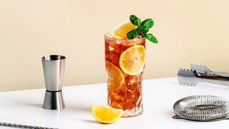 Plain store-bought iced tea also works wonderfully as a quick and simple mixer. Just pour your bourbon over ice and top up with sweat tea for a refreshing and balanced cold drink. Iced tea has sweetness and sometimes fruit flavor that balances the bitter flavor of black tea, which plays well against bourbon's intrinsic balance of sweetness and richness.