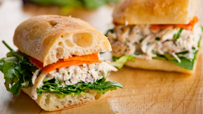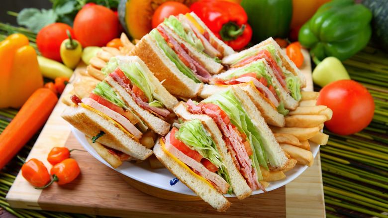 Essentially a BLT sandwich with turkey, the club sandwich is made of turkey, bacon, lettuce leaves, tomato slices, and mayonnaise, and it's easy to recreate at home. Sliced turkey deli meat is a convenient and easy choice here, though you can also use leftover turkey from Thanksgiving for a heartier and more flavorful sandwich. If you're not a fan of turkey, you can swap it out for chicken deli meat or even rotisserie chicken for a tasty take.