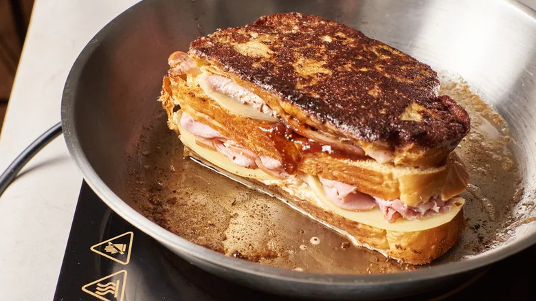 If you love the combination of sweet and savory ingredients, the Monte Cristo sandwich is the vintage sandwich for you. It's similar to the croque monsieur, a grilled cheese served in France — but unlike the croque monsieur, which is a purely savory concoction made with ham, Gruyère cheese, and béchamel sauce, the Monte Cristo also has sweet components. Specifically, it's made by layering ham, turkey, and Swiss cheese between white bread; then, the entire thing is dipped in an egg-milk batter (just like a stuffed French toast is prepared) and fried in butter until perfectly golden. The finished sandwich is then dusted with powdered sugar and served with a side of jam, preserves, or honey, which adds a complementary sweet element.