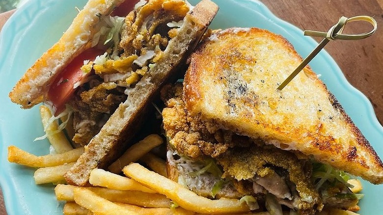 Another sandwich that was a hit during the 1950s is the oyster club sandwich, which can be considered a cross between an oyster po boy sandwich and a BLT sandwich. The filling is usually made by dunking oysters in buttermilk, then breading them in flour and frying them in bacon fat until crispy and golden. The fried oysters are then layered with strips of bacon, crispy lettuce leaves, juicy tomato slices, and creamy mayonnaise on toast, though a hard roll will likely do a better job at holding the ingredients in. In either case, it's a seafood lover's dream come true.