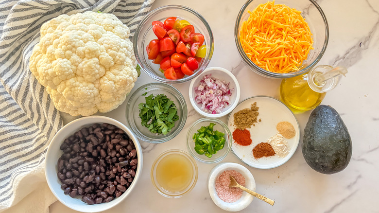 To make this recipe, start in the produce aisle and pick up cauliflower, limes, grape tomatoes, red onion, jalapeño, cilantro, and avocado. Then you'll need some cheese and black beans. To make this a vegan recipe, simply swap out dairy cheese for a vegan variety. Finally, check your spice and condiment cabinet for avocado oil, chili powder, garlic powder, onion powder, salt, and smoked paprika.