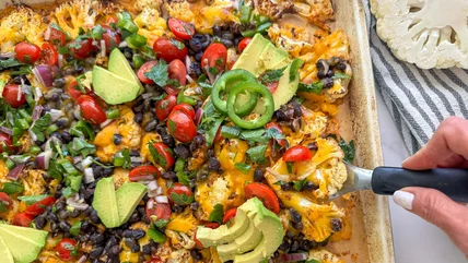 Wellness coach and recipe developer Miriam Hahn brings us this recipe and says, "I love the versatility of roasted cauliflower and the nice thing about this recipe is that it also can be served as a side dish." While this recipe also walks you through the steps of loading on toppings like black beans and avocado, you can ultimately garnish your cauliflower nachos with your personal favorite toppings.
