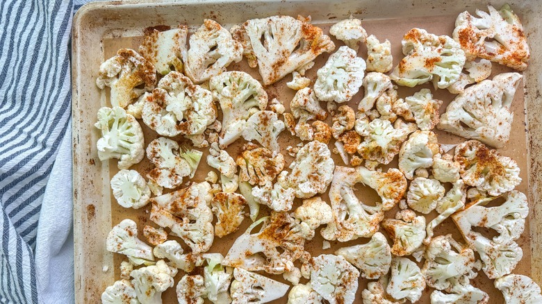 - Lay the seasoned cauliflower on a sheet pan and bake for 20 minutes.