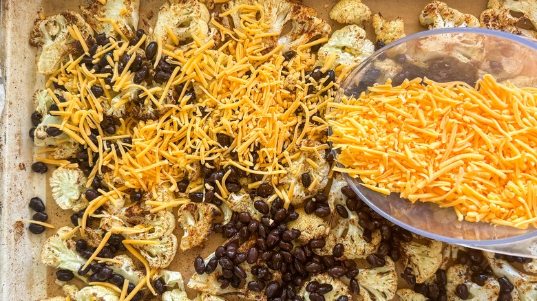 - When the cauliflower comes out of the oven, distribute beans on top, then add the cheese and bake for 5 more minutes, or until the cheese is melted.