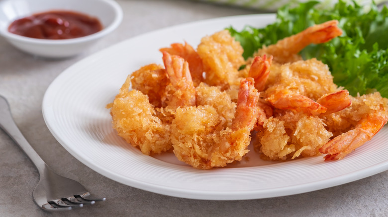While we're at it with the deep-fried shrimp advice, let's go back to the importance of using the right type of oil. It might be an unlikely choice, but corn oil is a budget-friendly variety for deep frying, and another unexpected type is safflower oil with its high smoke point. Other neutral oils like avocado, canola, and peanut also work — as long as you allow them to get hot enough first. No matter which oil you choose, the fried shrimp should be ready when golden brown on all sides with an internal temperature of 145 degrees Fahrenheit.