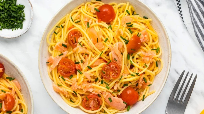 If you're a pescatarian, or just looking for meat and poultry alternatives, this type of cured fish is a great way to get in your protein, considering 3.5 ounces offers a whopping 18 grams. And because of its combination of saltiness, smokiness, and fatty acids, this salmon packs a flavor punch in a relatively small amount of fish. You only need 4 ounces of it to make the pasta dish here, which otherwise relies on only a few complementary ingredients. When it comes time to add in your salmon, all you need to do is divide it into chunks and throw it in the pan for a few minutes.