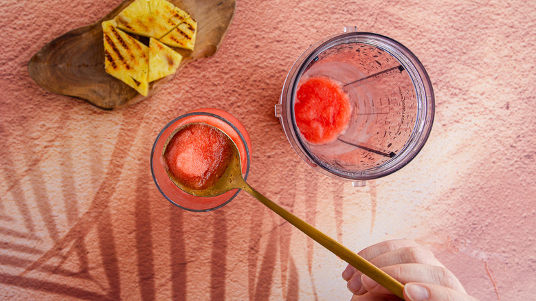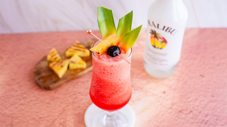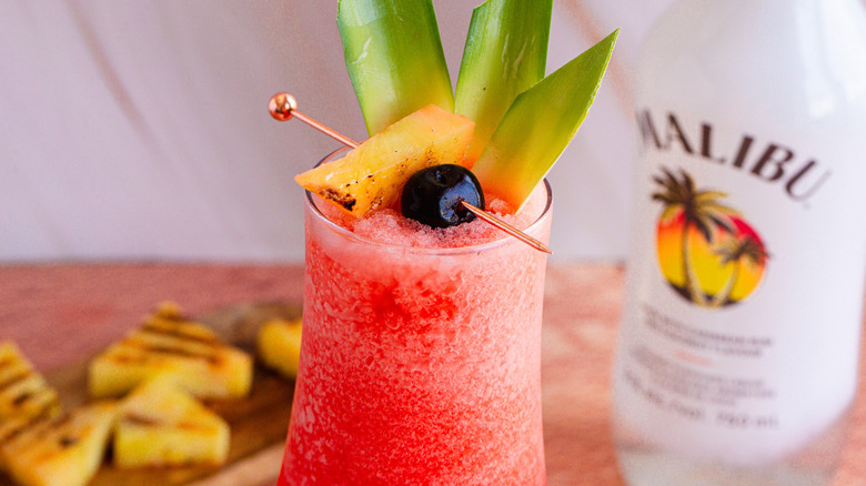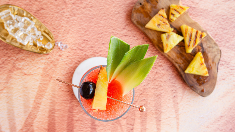This frosty beverage combines three types of rum — añejo, coconut, and dark — with fresh orange juice, pineapple juice, and grenadine. But what really makes this cocktail stand out is the garnish. A piece of charred pineapple adds a smoky note that contrasts beautifully with the drink's granita-like texture. Add an amarena cherry and some fresh pineapple leaves to the glass, and you've got yourself one good-looking beverage.