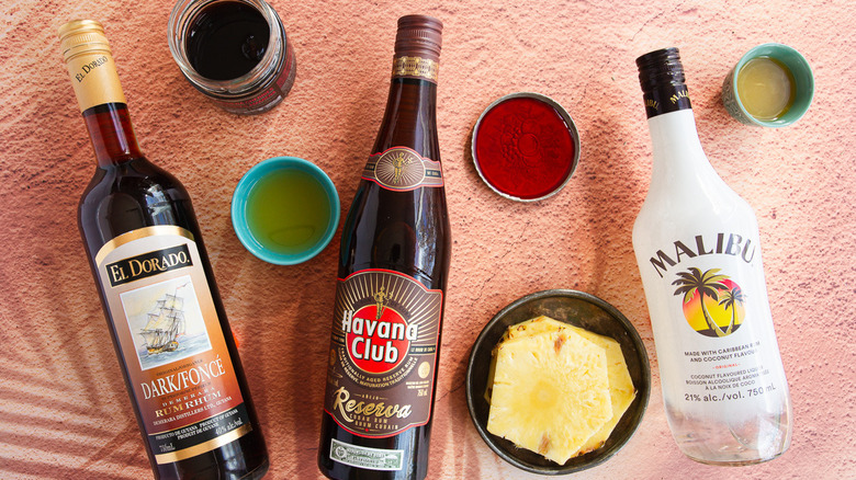 Gather the ingredients for your triple rum frozen Bahama mama cocktail