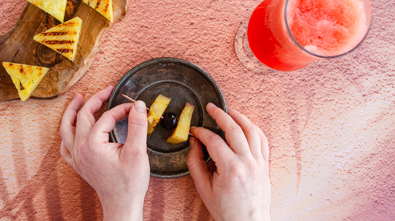 - Garnish the drink with the prepared cocktail pick and pineapple leaves, if using.