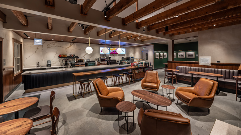 The outside of the Williamsburg store showcases white siding and a red-brick patio — sounds rather traditional, right? A closer look shows the metal bins on the side of the building that seem to be part of the irrigation system used to water its plants. It's got the iconic green Starbucks sign above its door, but when you walk in there's a blend of old and new aesthetics. It's quite a swanky location with exposed brick walls, wood-beamed ceilings, and Mid-century style chairs paired with those recycled-wood banquettes. It might not serve the Starbucks menu items in South Korea that we wish we had here in the U.S., but you might score one of those collectible mugs.
